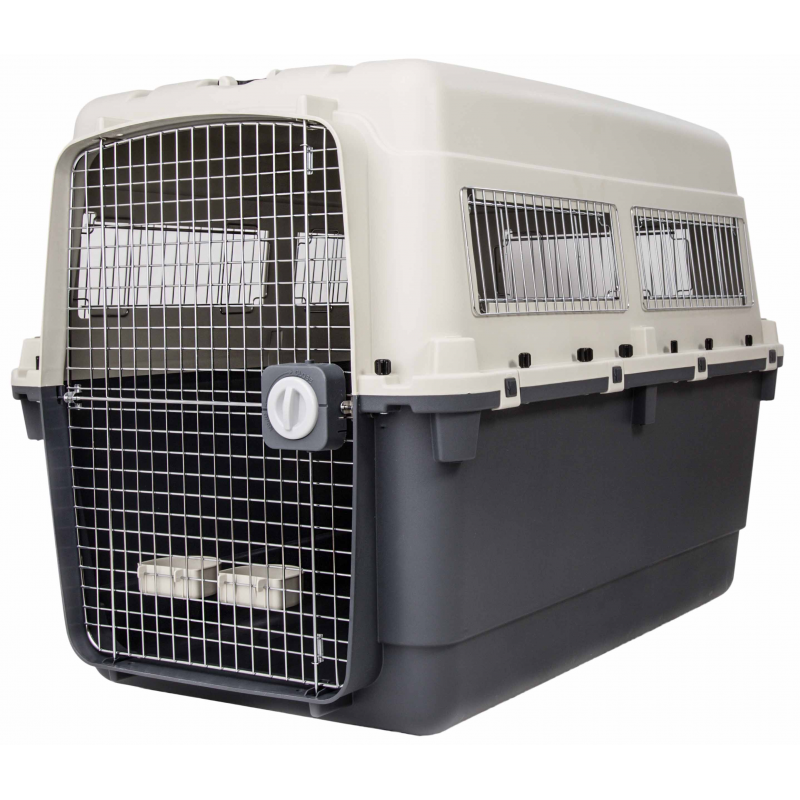 JUMBO Óriás Szállítóbox: Mérete: 122*83*89 cm. 6 pontos biztonsági zárral ellátott, fém ajtós, oldalain fém rácsos szellőző nyílás, a szárnyas csavarokkal könnyen összeszerelhető, rendkívül masszív, biztonságos, prémium minőségű szállítóbox. A szállítóbox 2 db etető-itató tálat tartalmaz. Nagytestű kutyáknak ajánlott (Például: Bernáthegyi, Nápolyi Masztiff, stb.)